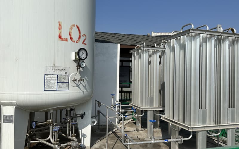 中心供氧站采用5立方液态氧储罐,两个50立方/小时的汽化器,通过管道输送到大楼