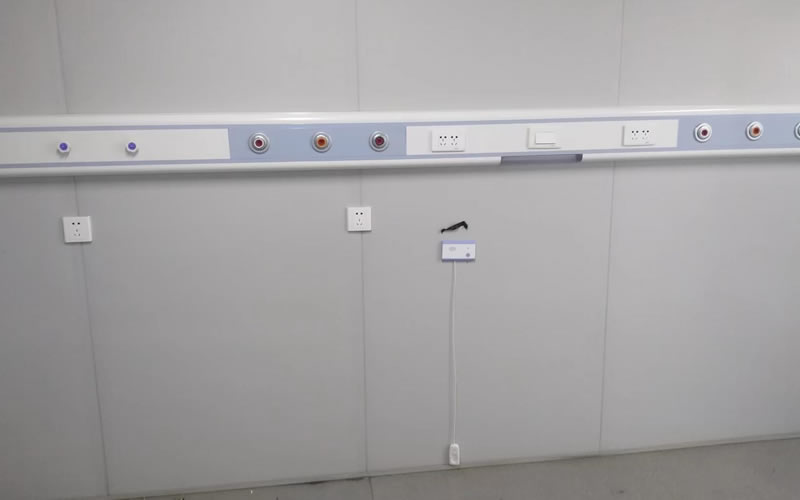 方舱医院病房床头安装医疗设备带,每个床位配备一个氧气终端口、一个吸引终端口、一个空气终端口和电源插座床头灯以及紧急呼叫对讲设备。