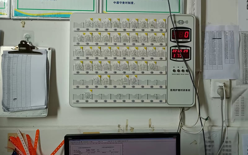 每个楼层病区的护士站安装一台呼叫对讲系统主机,走廊安装双面显示屏。此款医院病房呼叫对讲系统为两芯总线制,护士站主机集系统控制主机、对讲电话机、病员一览卡槽设计,被广泛应用于乡镇卫生院护士站病床呼叫对讲使用。