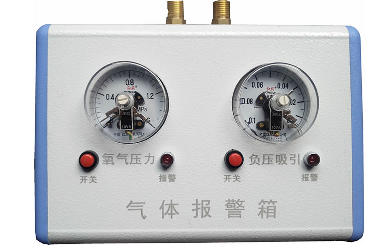 2、报警箱装置:在护士站安装报警箱,当送往大楼的氧气压力升高或下降超出规定值时,报警箱同样发出声光报警信号,提醒有关人员及时处理。