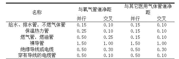 医用气体管道与其他管道之间的最小间距应符合下表2规定。无法满足时应采取适当隔离措施。