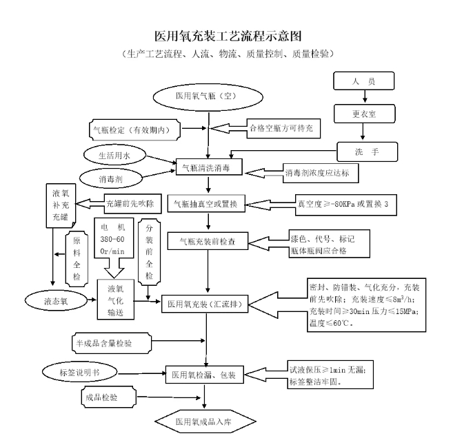 3.检验合格的气瓶按《气瓶干燥抽真空标准操作规程》进行空瓶抽真空或置换,操作完毕进行医用氧的充装,充气前仔细检查连接装置是否牢靠,充气时随时观察压力表的变化及瓶内是否有异响,当压力升高到9.81MPa和12.26MPa时,检查瓶身温度不应超压充装;充气速度应保持在8立方米每小时,且充装时间不应小于30分钟。