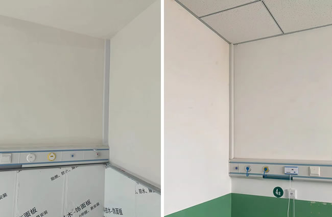 明管加装饰罩的中心供氧管道安装方式很好理解,根据医用气体工程技术规范的要求,气体管道是不允许预埋到墙里面的,其目的是预防墙体内管道破裂漏气以及考虑将来检修维修方便。上方左图为某县级人民医院病房装修改造医用气体工程,病房内棚顶至设备带中心供氧管道和中心负压吸引管道采用明管装饰罩的方式。右图为某正常营业中乡镇卫生院中心供氧管道,和医用中心负压吸引管道天花板至设备带的气体管道安装效果。