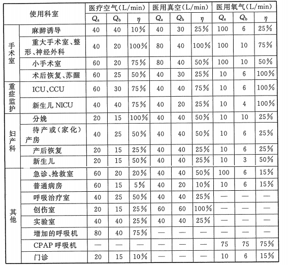 2 表中普通病房、创伤科病房的医疗空气流量系按病人所吸氧气需与医疗 空气按比例混合并安装医疗空气终端时的流量。