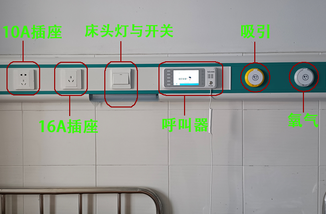 医院普通病房床头医用设备带上的设备,根据不同档次及科室病房的具体需求一般会安装:中心供氧系统氧气、真空负压、压缩空气、呼叫器分机、插座、照明、网络口等医用气体和医护辅助设备。