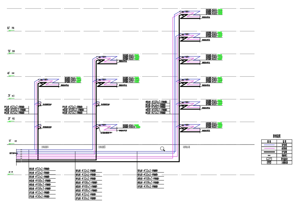 上图图为医院项目,三栋病房楼需用气,气体管道均采用不锈钢管,按国家标准GB 50751-2012年《医疗气体工程技术规范》的要求,医院各病房的分布,以及医院每天对气体的需求,从各中心站连接到各用气点。管道应满足GB/T14976-2012《流体输送不锈钢无缝钢管》的要求。各种规格的阀门、三通和接头均采用优质不锈钢,阀门内与氧气接触的部分严禁使用含油或可燃材料。进入病房前,管道用支架和箍固定在适当的位置。每张床供氧的管道通过每个病房的角落,并用铝合金装置覆盖到床头,以确保病房的美观。同时,穿墙、穿地板的管道应加套管,但管道焊缝不得放置在套管内。穿墙管的长度不应小于墙厚和地板厚度,套管两端应用石棉密封。管道应可靠接地。每个子系统(病房或独立单元)应安装一个维修阀,以便于维护。